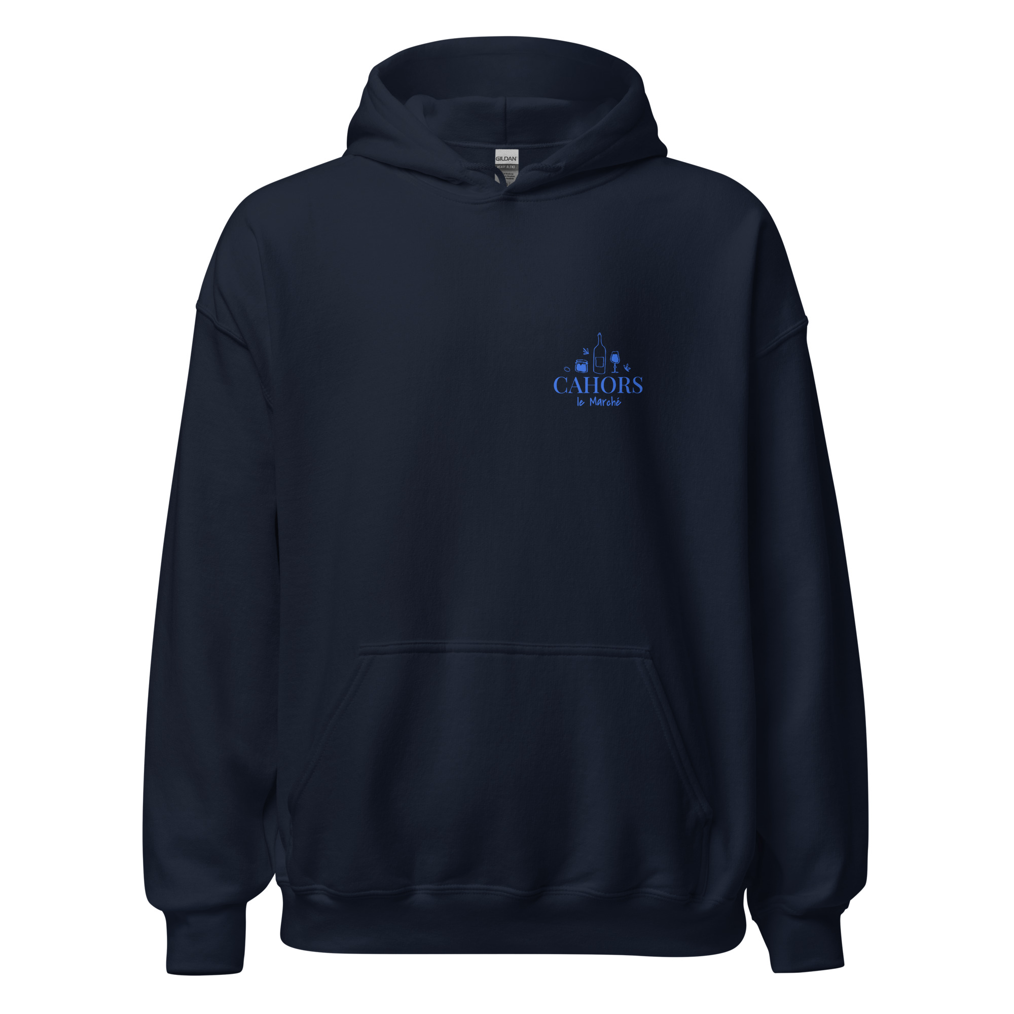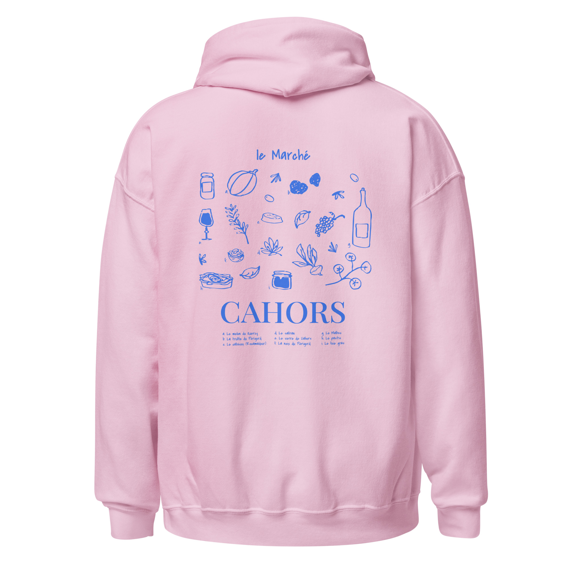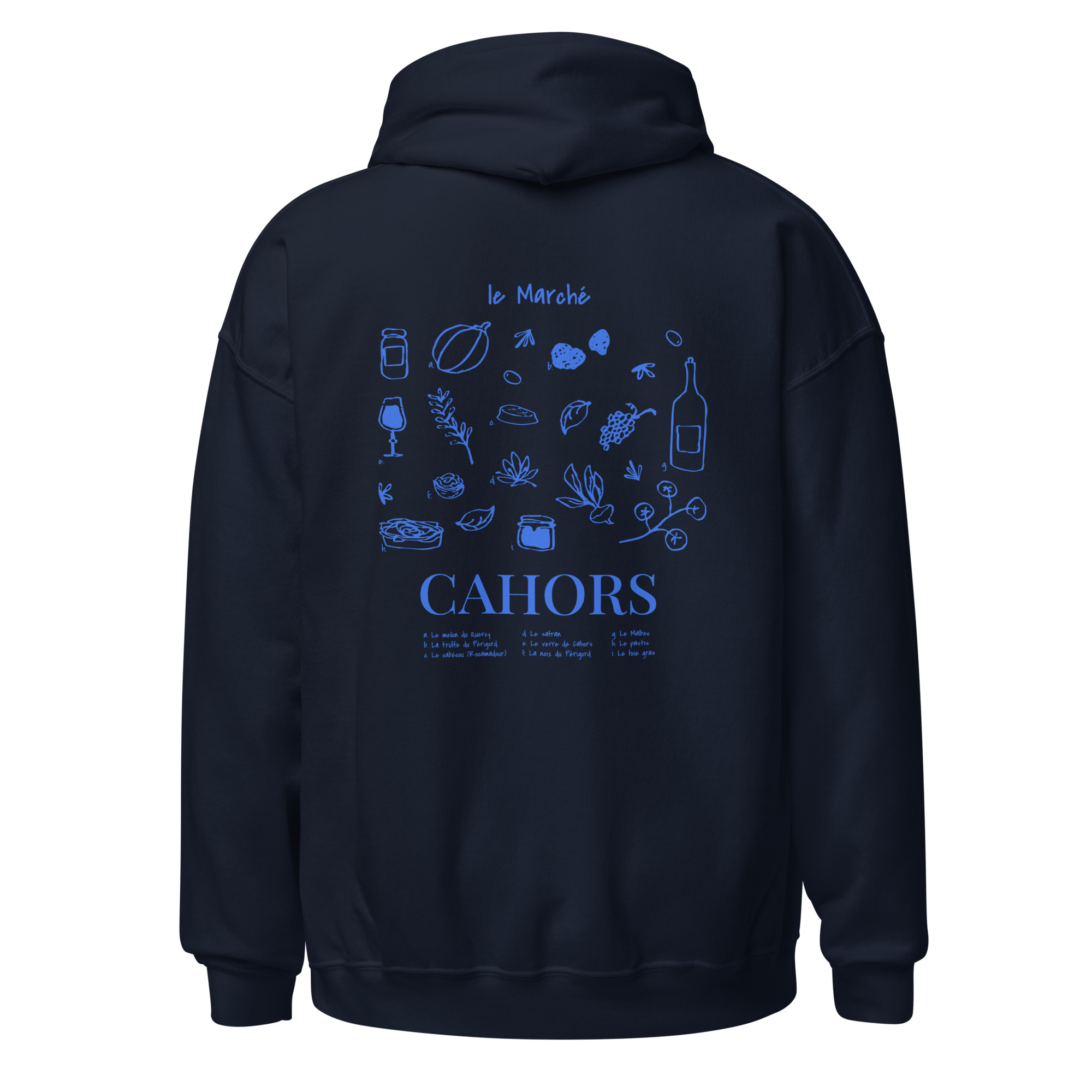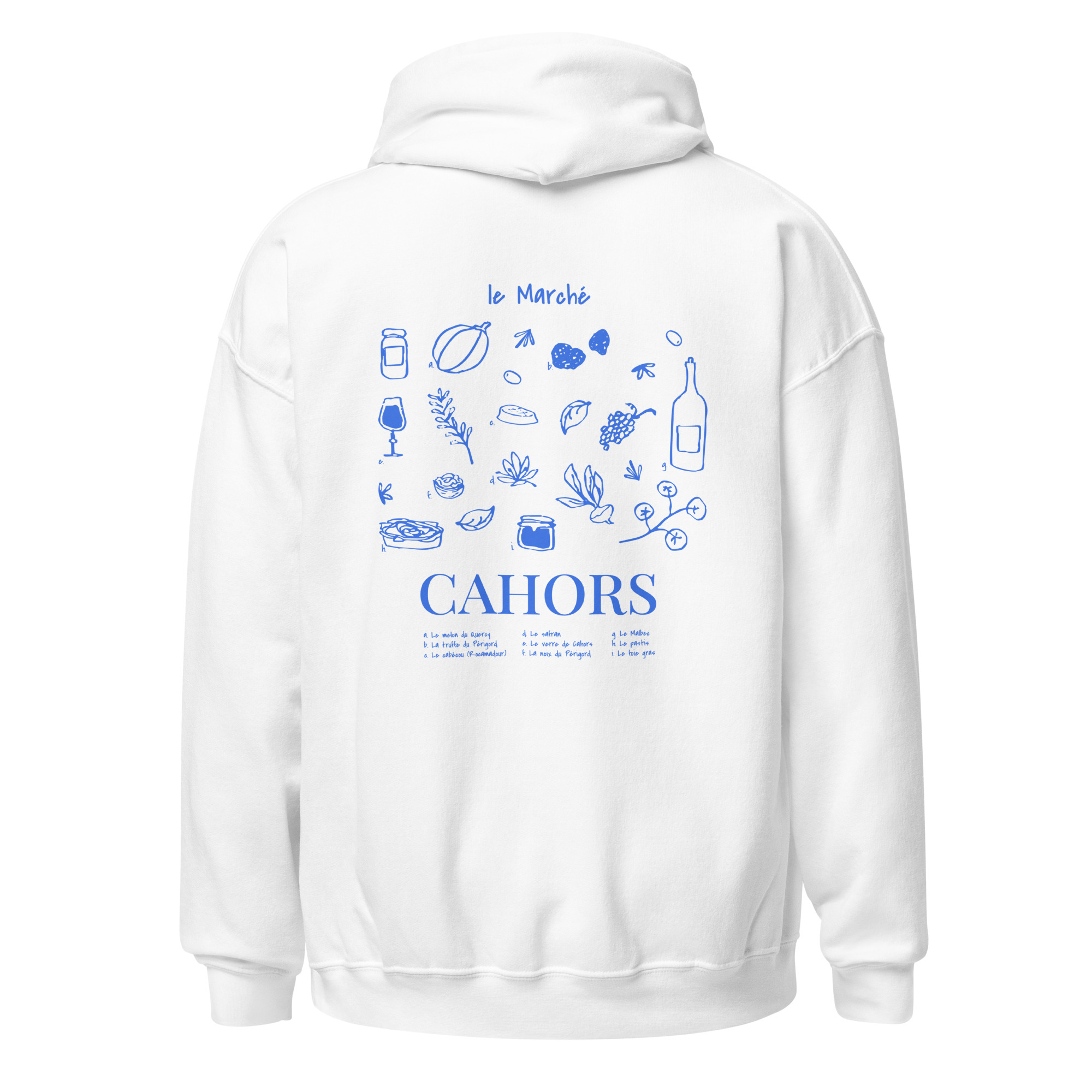 Ce visuel met à l’honneur les produits emblématiques du marché de Cahors et du Quercy. Illustrés dans un style graphique simple et monochrome, on y retrouve le melon du Quercy, la truffe du Périgord, le cabécou de Rocamadour, le safran, le verre de Cahors, la noix du Périgord, le Malbec, le pastis et le foie gras.